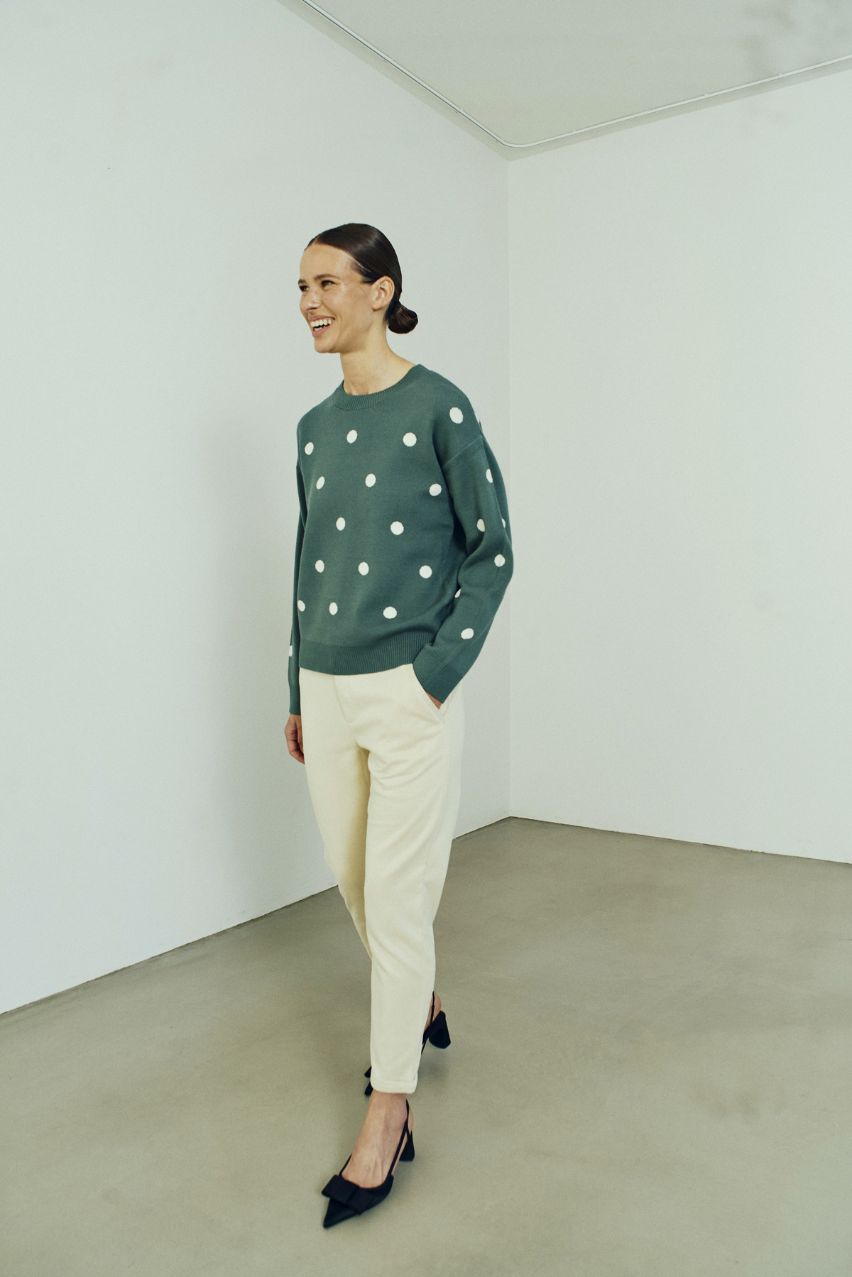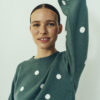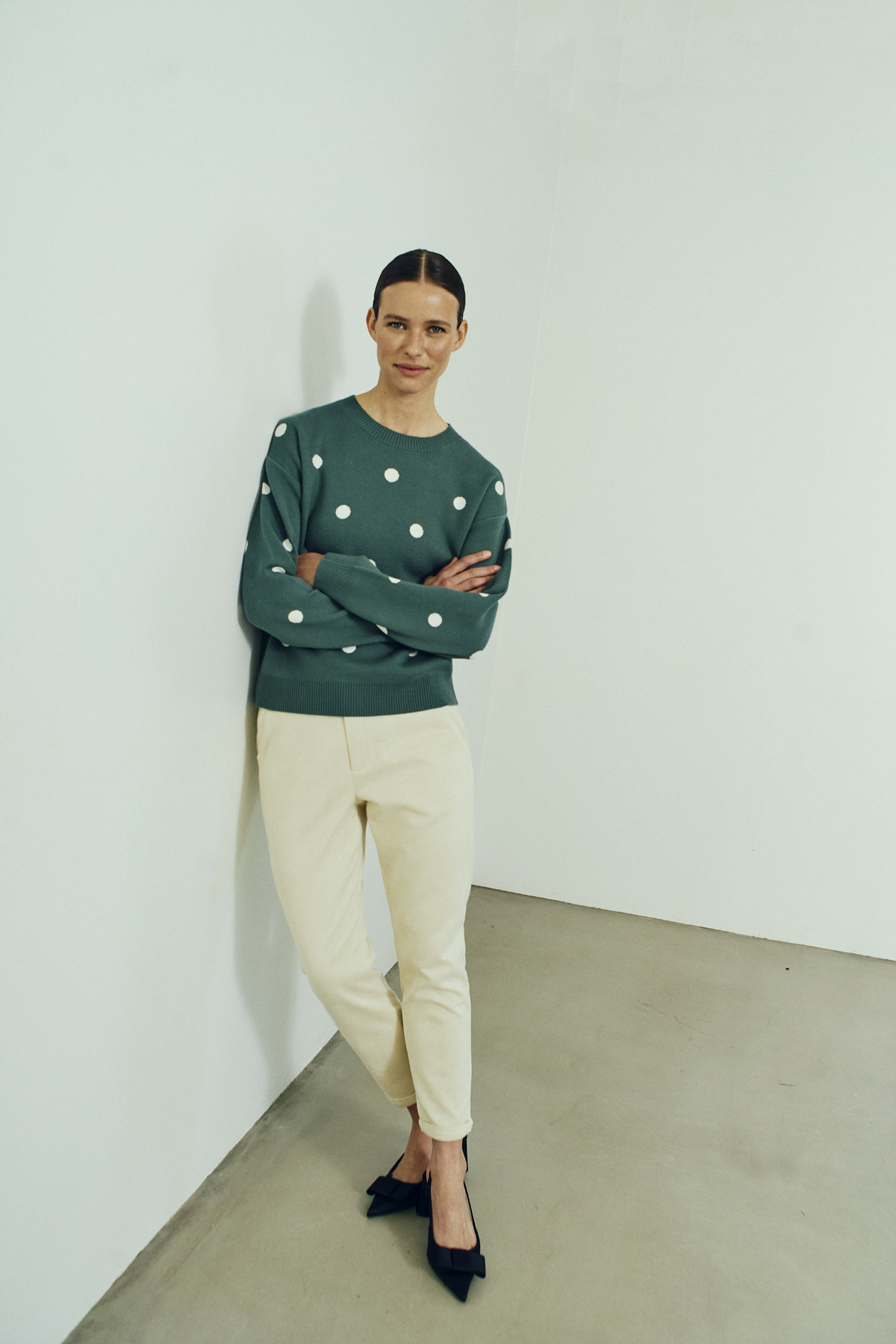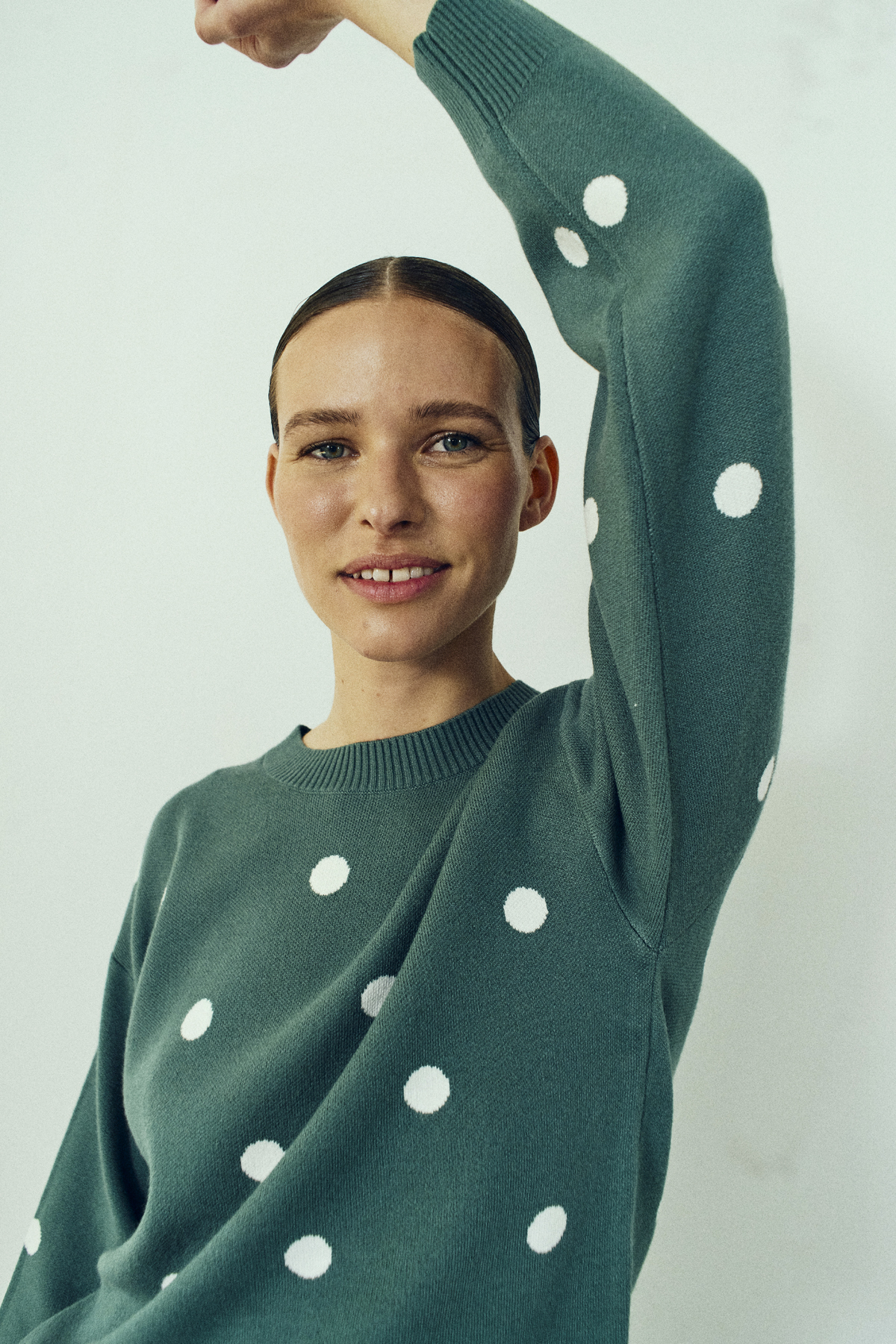 Details: Ronde halslijn, geribde boorden en een allover stippenprint in off-white. Tijdloos met een speelse touch.