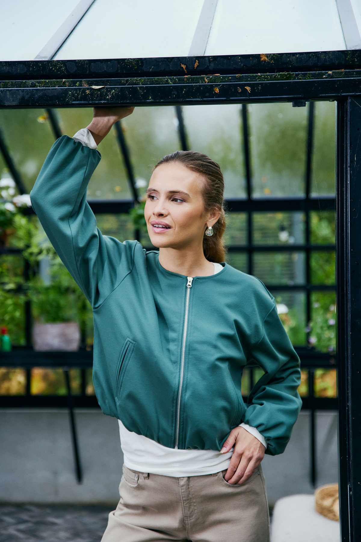 Het jasje heeft een loose fit en valt net op de heup, met een subtiele elastische zoom waardoor je silhouet nog steeds slank blijft. De ronde hals en de cleane ritssluiting geven ‘m een moderne, minimal look, terwijl de lange, licht volumineuze mouwen en de steekzakken zorgen voor een relaxed feel.