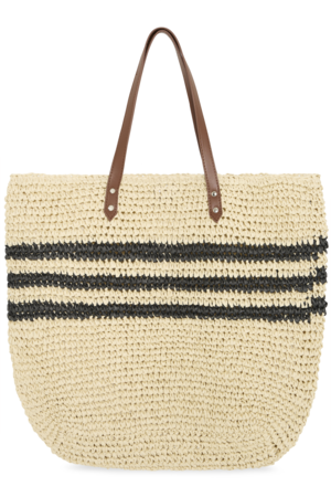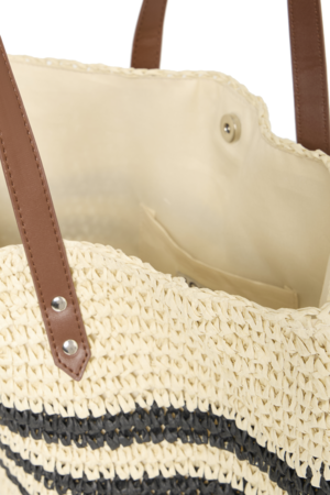 Gevlochten strandtas natural met strepen – ruime shopper van papiermix, licht en stijlvol voor strand en vakantie.