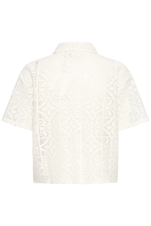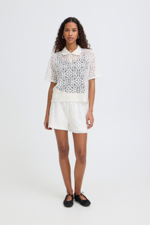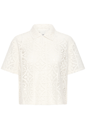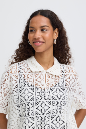 ICHI Naima lace top kopen? Luchtige zomertop met kraag, korte mouw en vrouwelijke opengewerkte structuur.
