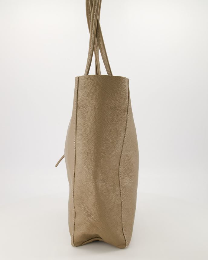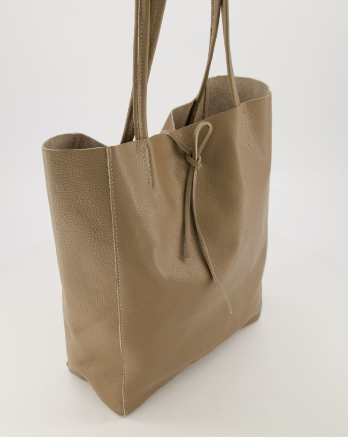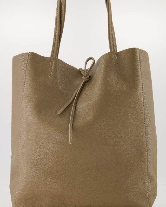 Deze soepelvallende leren shopper heeft aan de bovenkant een touwsluiting. Aan de binnenzijde zit een vakje met een ritssluiting.