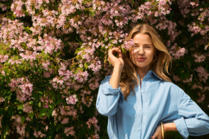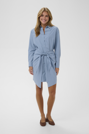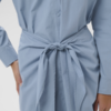 Lichtblauwe blousejurk met lange mouwen en strikceintuur, gedragen in een vrouwelijke en casual look.Saint Tropez | PersiaSZ Blousejurk – lichtblauwe jurk met strikceintuur