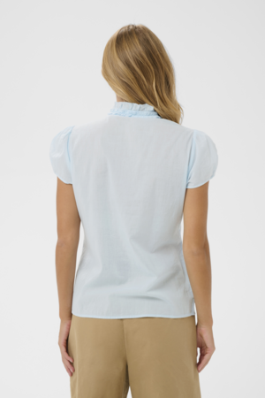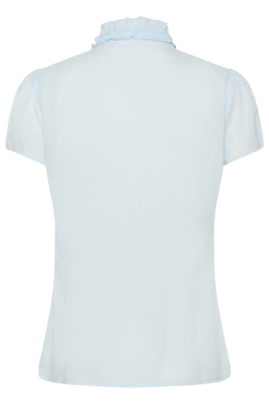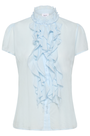 Details: Ruches aan de voorzijde, hoge hals met ruffle en korte mouwen