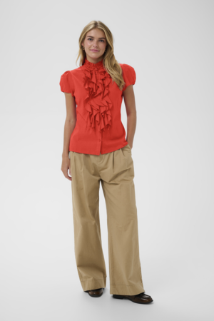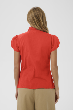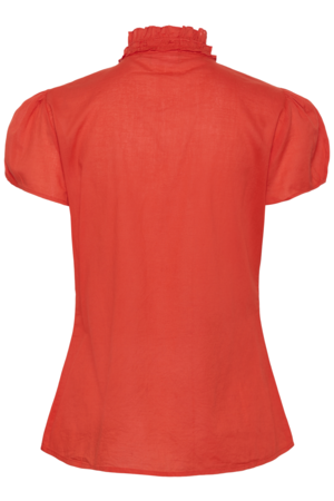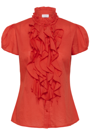 Details: Ruches aan de voorzijde, hoge hals met ruffle en korte mouwen